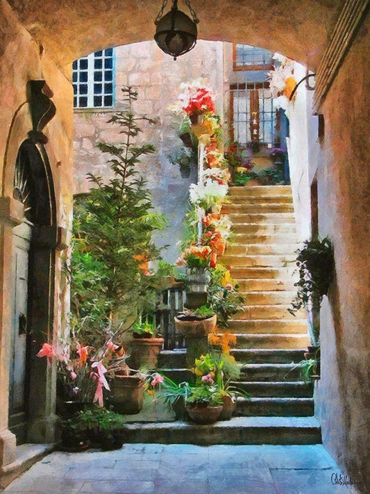 Steps with Flowers White Modern Wood Framed Art Print with Double Matting by Medeiros, Celito
