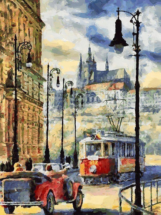 Tram in Prague White Modern Wood Framed Art Print with Double Matting by Medeiros, Celito