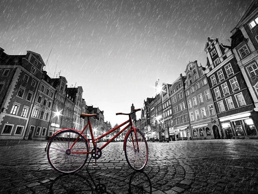 Red Bike on Cobble Stone Street White Modern Wood Framed Art Print with Double Matting by Bednarek, M.