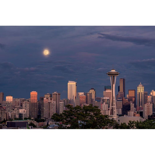 Downtown Seattle with a full moon rising in the evening sky-Seattle-Washington State Black Modern Wood Framed Art Print with Double Matting by Probst, Greg