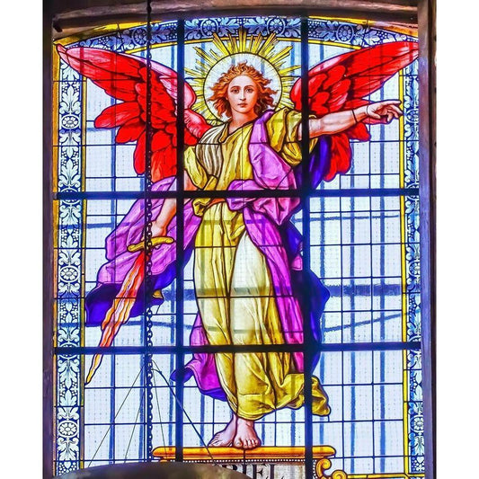 Colorful Archangel Uriel Stained glass Cathedral Puebla-Mexico Built in 15 to 1600s Black Modern Wood Framed Art Print with Double Matting by Perry, William