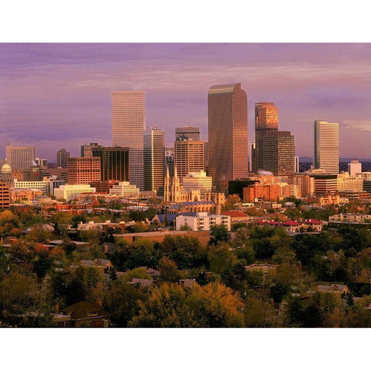 Denver-Colorado skyline glistens in early morning during sunrise against the Rocky Mountains Black Modern Wood Framed Art Print with Double Matting by SMO