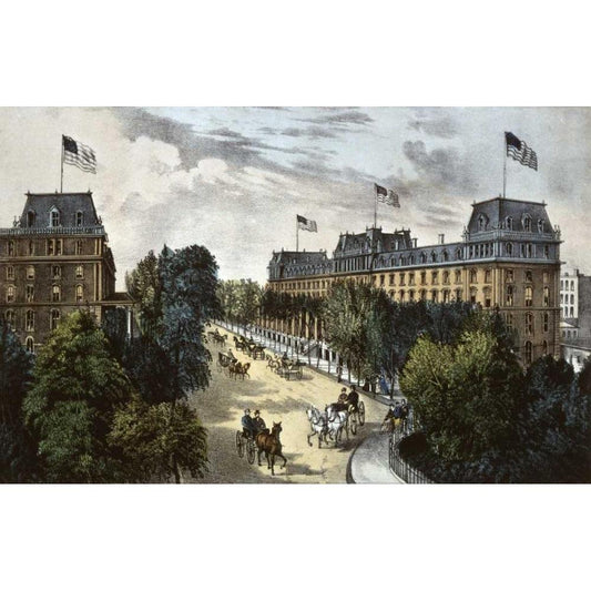 Broadway New York Black Modern Wood Framed Art Print with Double Matting by Currier and Ives