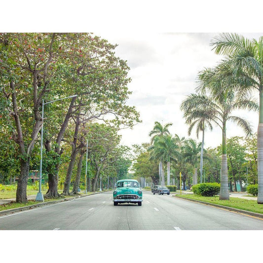 Vintage car on a road with palm trees, Cuba Black Modern Wood Framed Art Print with Double Matting by Frank, Assaf