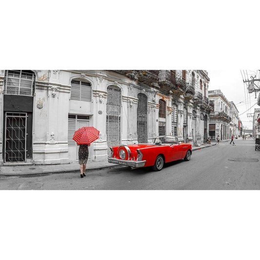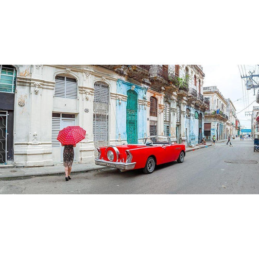 Woman with red umbrella by a vintage car on the street of Havana-Cuba Black Modern Wood Framed Art Print with Double Matting by Frank, Assaf