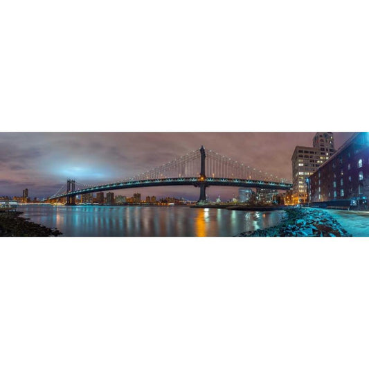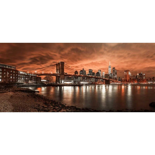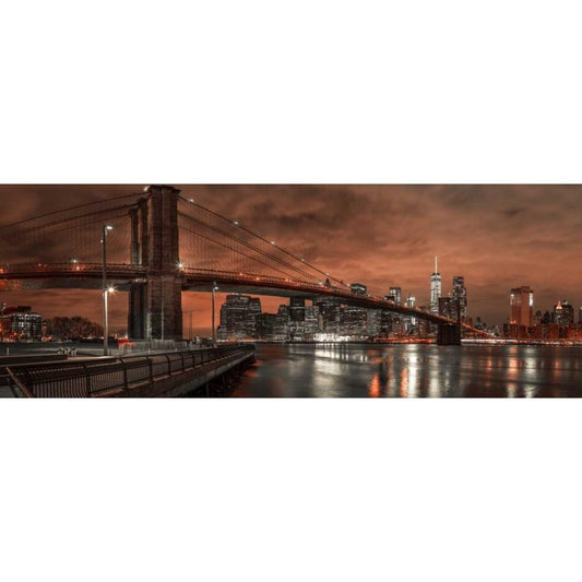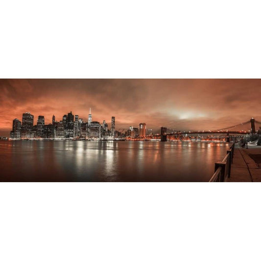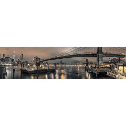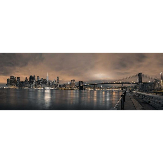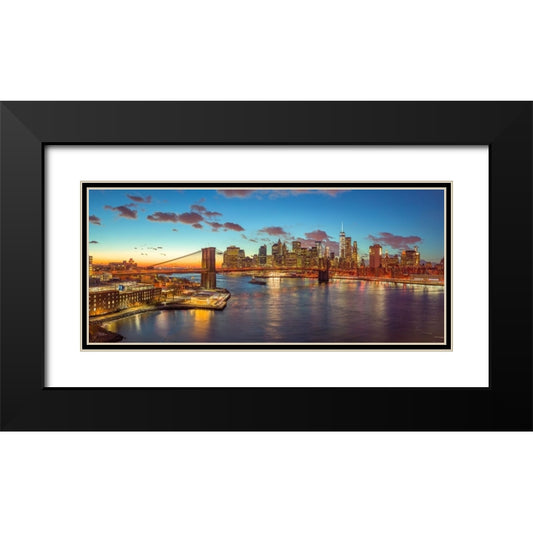 Evening view of Lower Manhattan skyline with Brooklyn bridge over East river, New York Black Modern Wood Framed Art Print with Double Matting by Frank, Assaf