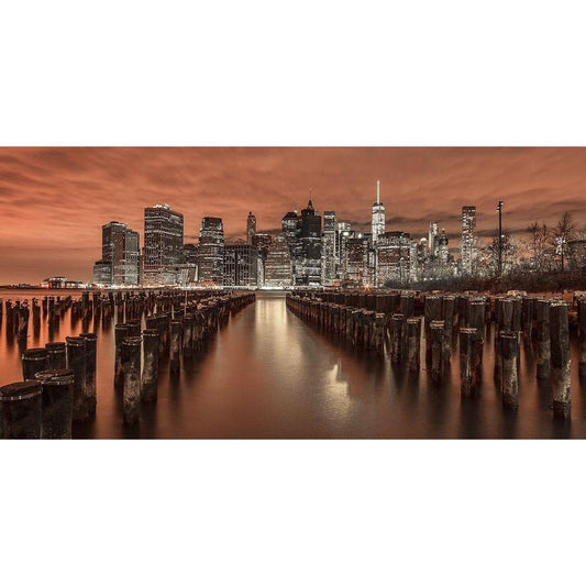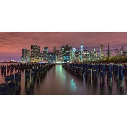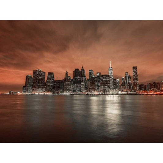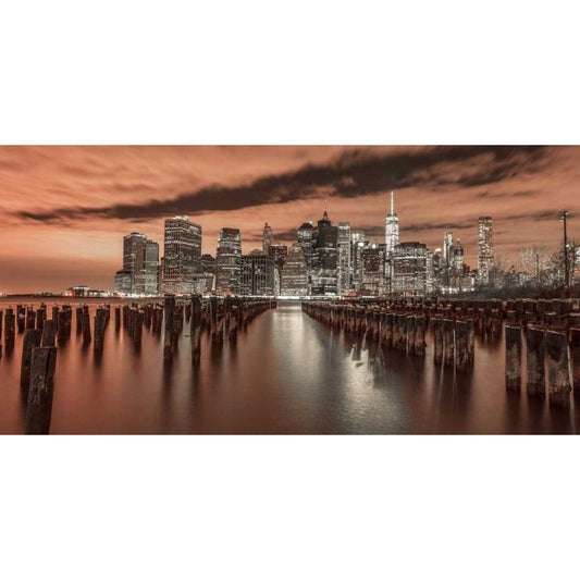 Evening view of Lower Manhattan skyline, New York Black Modern Wood Framed Art Print with Double Matting by Frank, Assaf