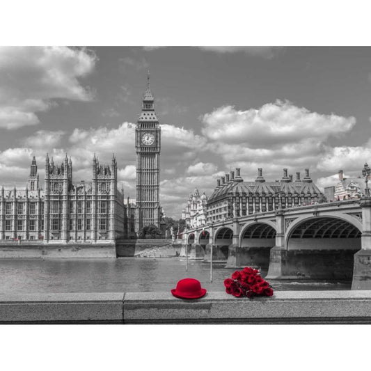 Bunch of Roses and hat on Thames promenade agaisnt Big Ben, London, UK Black Modern Wood Framed Art Print with Double Matting by Frank, Assaf