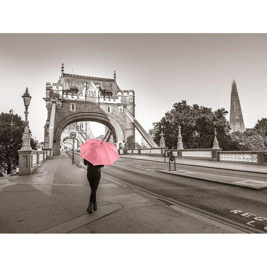 Lady with a pink umbrella, Tower bridge, London Black Modern Wood Framed Art Print with Double Matting by Frank, Assaf