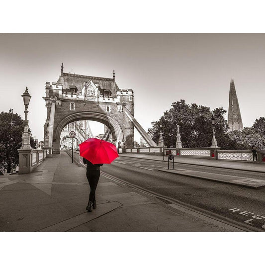 Tourist with umbrella on Tower Bridge, London, UK Black Modern Wood Framed Art Print with Double Matting by Frank, Assaf