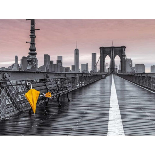 Yellow umbrella and bunch of roses on bench on pedestrian pathway, Brooklyn bridge, New York Black Modern Wood Framed Art Print with Double Matting by Frank, Assaf