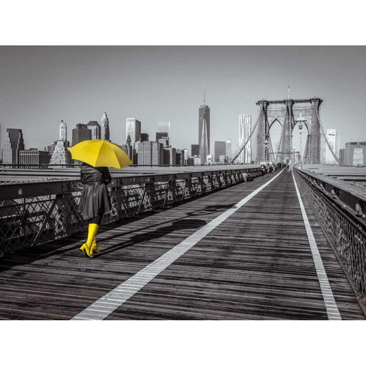 Female tourist with umbrella taking a walk on pedestrian walkway on Brooklyn bridge, New York Black Modern Wood Framed Art Print with Double Matting by Frank, Assaf