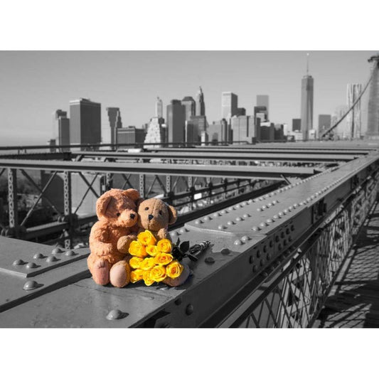 Pair of teddy bears and bunch of roses on Brooklyn Bridge, New York Black Modern Wood Framed Art Print with Double Matting by Frank, Assaf