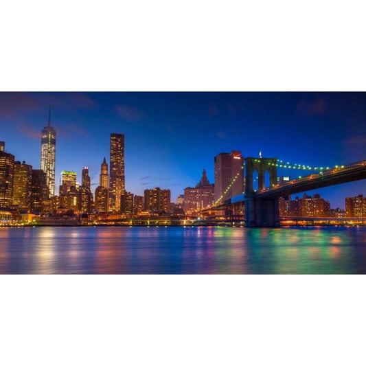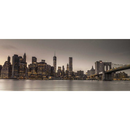 Evening shot of Lower Manhattan skyline and Brooklyn Bridge, New York Black Modern Wood Framed Art Print with Double Matting by Frank, Assaf