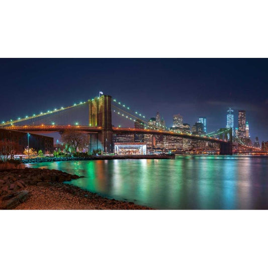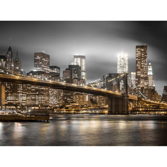 Evening shot of Brooklyn Bridge and Lower Manhattan skyline, New York Black Modern Wood Framed Art Print with Double Matting by Frank, Assaf