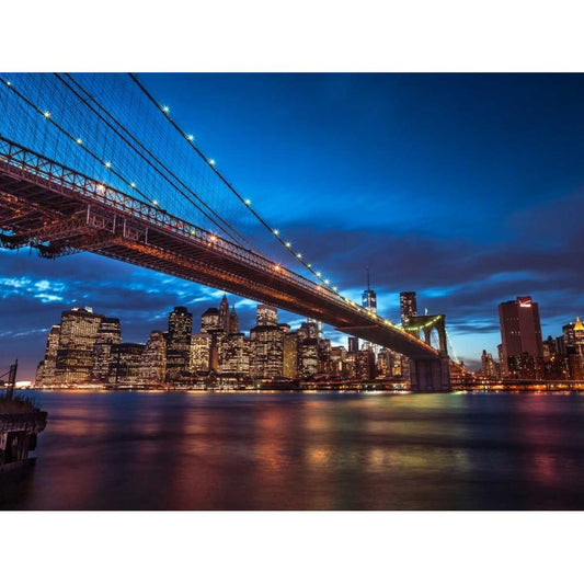 Brooklyn Bridge and lower Manhattan skyline at dusk, New York Black Modern Wood Framed Art Print with Double Matting by Frank, Assaf