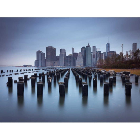 Lower Manhattan Skyline with pier pilings in east river, New York, USA Black Modern Wood Framed Art Print with Double Matting by Frank, Assaf
