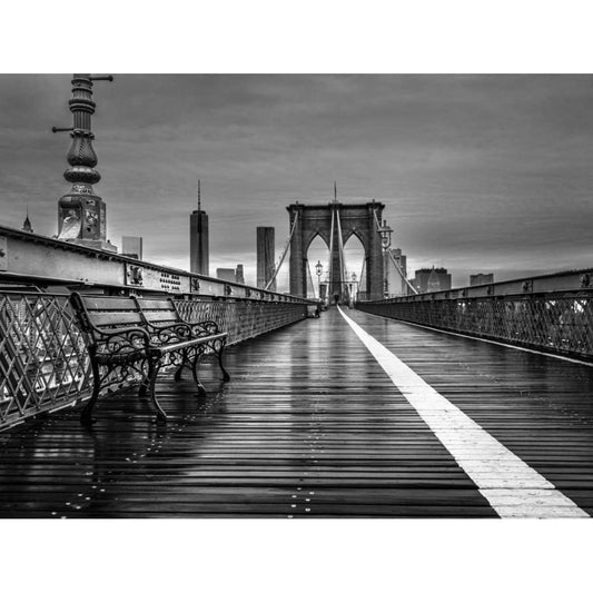 Empty bench on the pedestrian walkway of the Brooklyn Bridge, New York Black Modern Wood Framed Art Print with Double Matting by Frank, Assaf