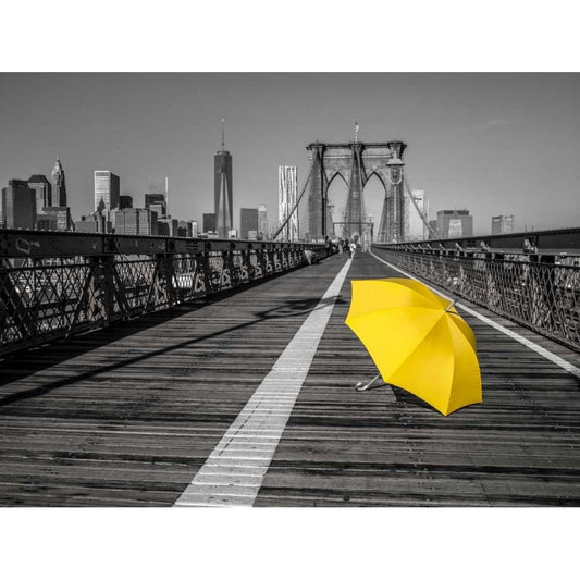 Yellow umbrella on pedestrian walkway on Brooklyn bridge, New York Black Modern Wood Framed Art Print with Double Matting by Frank, Assaf