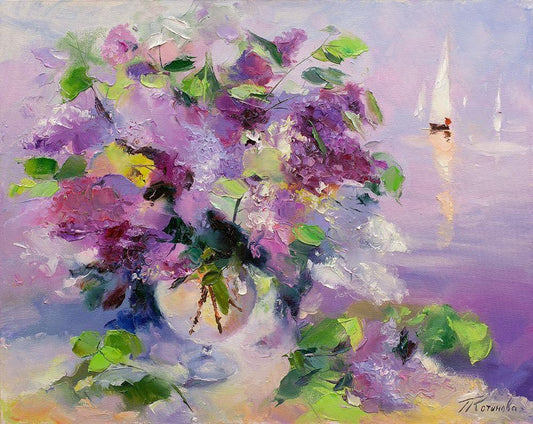 Lilac and yachts White Modern Wood Framed Art Print with Double Matting by Kotinova, Galina