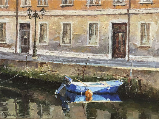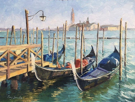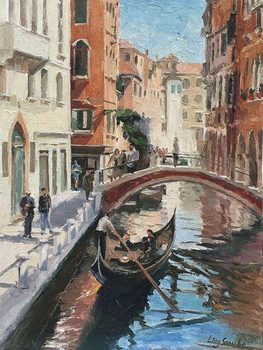The Gondola at Venice White Modern Wood Framed Art Print with Double Matting by Strube, Ling