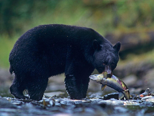 Black bear with salmon White Modern Wood Framed Art Print with Double Matting by Fitzharris, Tim