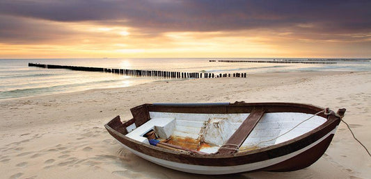 Boat at Lake Pier, Color White Modern Wood Framed Art Print with Double Matting by Anonymous