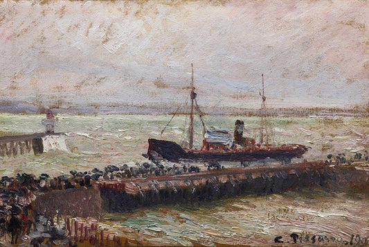 Entrance to the Harbour at Le Havre, Overcast Sky White Modern Wood Framed Art Print with Double Matting by Pissarro, Camille
