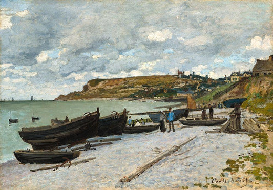 Boats on the Beach at Étretat White Modern Wood Framed Art Print with Double Matting by Monet, Claude