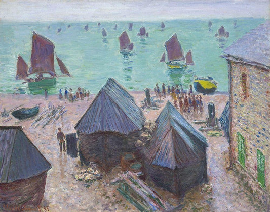 The Departure of the Boats, Étretat White Modern Wood Framed Art Print with Double Matting by Monet, Claude