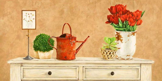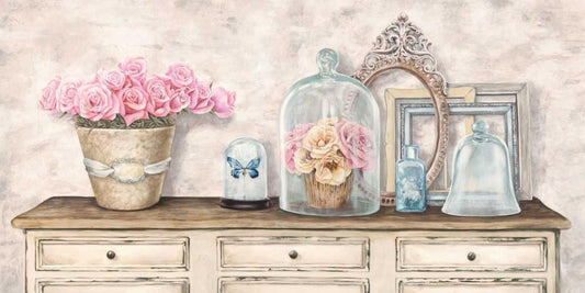 Floral setting with glass vases I White Modern Wood Framed Art Print with Double Matting by Thomlison, Jenny