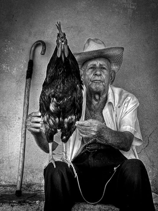 The Old Man With His Figting Cock White Modern Wood Framed Art Print with Double Matting by Mazalrey, Alain