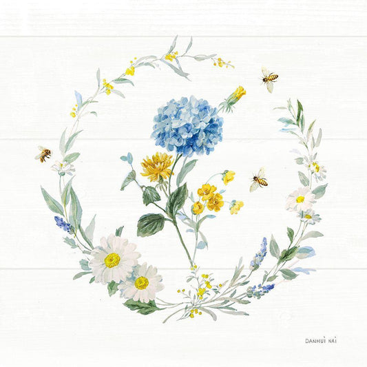 Bees and Blooms Flowers V with Wreath White Modern Wood Framed Art Print with Double Matting by Nai, Danhui