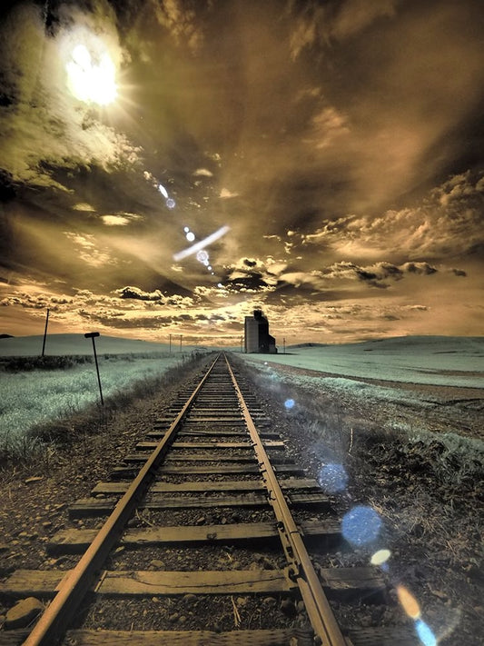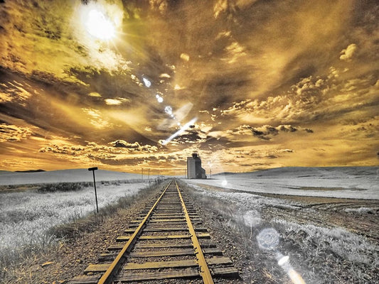 USA-Washington State-Palouse-Backcountry rail Road and Silo through wheat field with clouds White Modern Wood Framed Art Print with Double Matting by Eggers, Terry