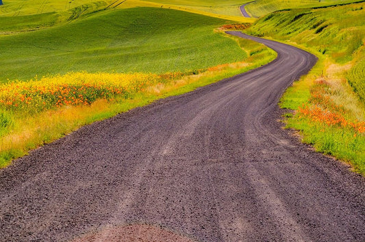 USA-Washington State-Palouse with gravel curved road edged with Poppies and Yellow Canola White Modern Wood Framed Art Print with Double Matting by Gulin, Sylvia