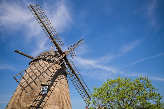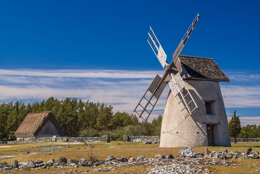 Sweden-Faro Island-Eroskogs-old windmill White Modern Wood Framed Art Print with Double Matting by Bibikow, Walter