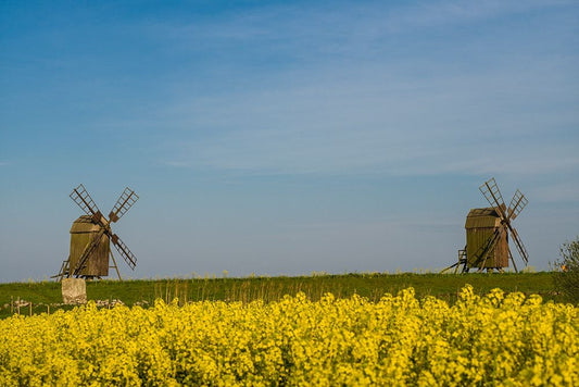 Sweden-Oland Island-Lerkaka-antique wooden windmills White Modern Wood Framed Art Print with Double Matting by Bibikow, Walter