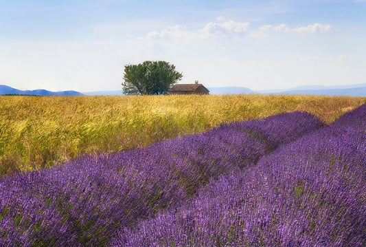 Europe-France-Provence-Valensole Plateau-Lavender and wheat crops with tree and house White Modern Wood Framed Art Print with Double Matting by Jaynes Gallery
