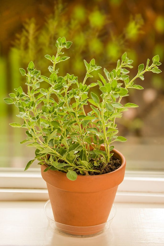Issaquah-Washington State-USA Clay pot of Greek Oregano sitting on a windowsill Black Ornate Wood Framed Art Print with Double Matting by Horton, Janet