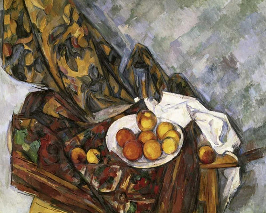 Still Life with Floral Curtain Black Ornate Wood Framed Art Print with Double Matting by Cezanne, Paul