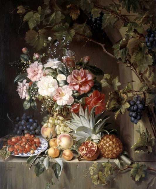 Still Life of Fruit and Flowers Black Ornate Wood Framed Art Print with Double Matting by Hyugens, Francois Joseph
