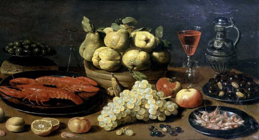 Still Life With Seafood Black Ornate Wood Framed Art Print with Double Matting by Van Es, Jacop Fobsen