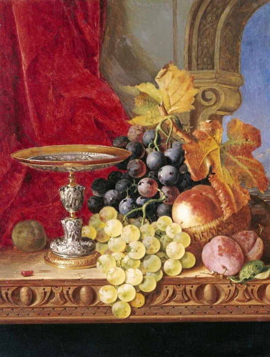 Grapes and a Peach Black Ornate Wood Framed Art Print with Double Matting by Ladell, Edward