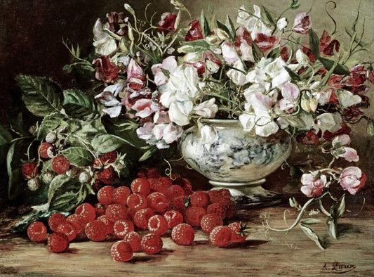 Raspberries and Sweet Pea Black Ornate Wood Framed Art Print with Double Matting by Laux, August