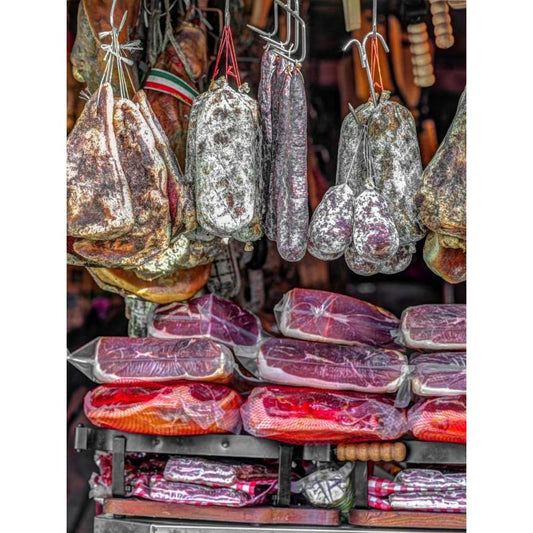 Various salami hanging in a window of an Italian Salami shop, Rome, Italy Black Modern Wood Framed Art Print with Double Matting by Frank, Assaf