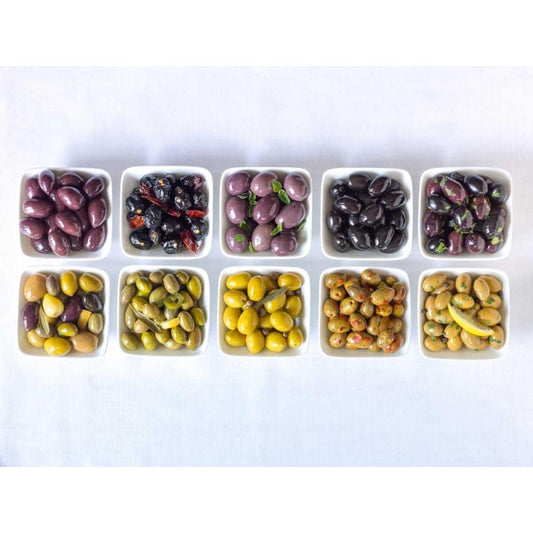 Varieties of Olives in bowls on white background Black Modern Wood Framed Art Print with Double Matting by Frank, Assaf