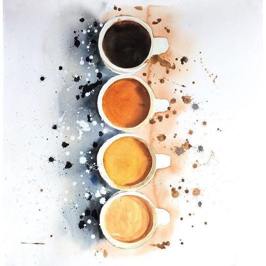 FOUR CUPS OF COFFEE WITH PAINT SPLASH White Modern Wood Framed Art Print by Atelier B Art Studio