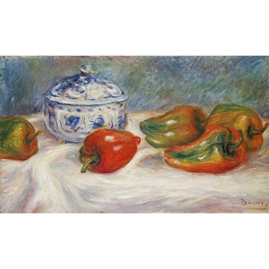 Still Life With a Blue Sugar Bowl and Peppers White Modern Wood Framed Art Print by Renoir, Pierre-Auguste