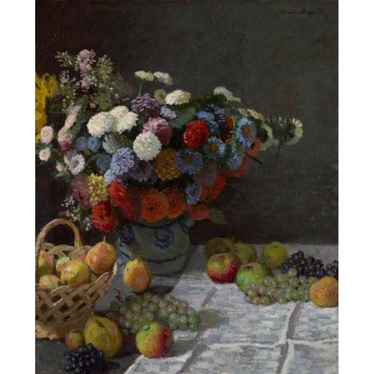 Still Life with Flowers and Fruit Gold Ornate Wood Framed Art Print with Double Matting by Monet, Claude