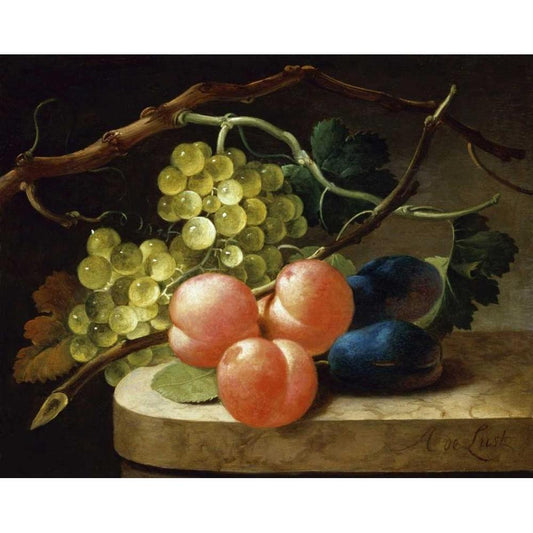 Grapes on a Vine, Peaches and Plums on a Ledge Black Modern Wood Framed Art Print by Follwer of Antoni de Lust